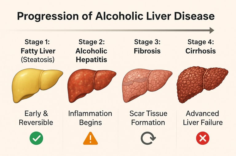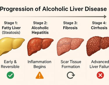This condition is part of a spectrum of alcoholic liver diseases, which can progress from fatty liver to alcoholic hepatitis and eventually to cirrhosis and liver failure if untreated.